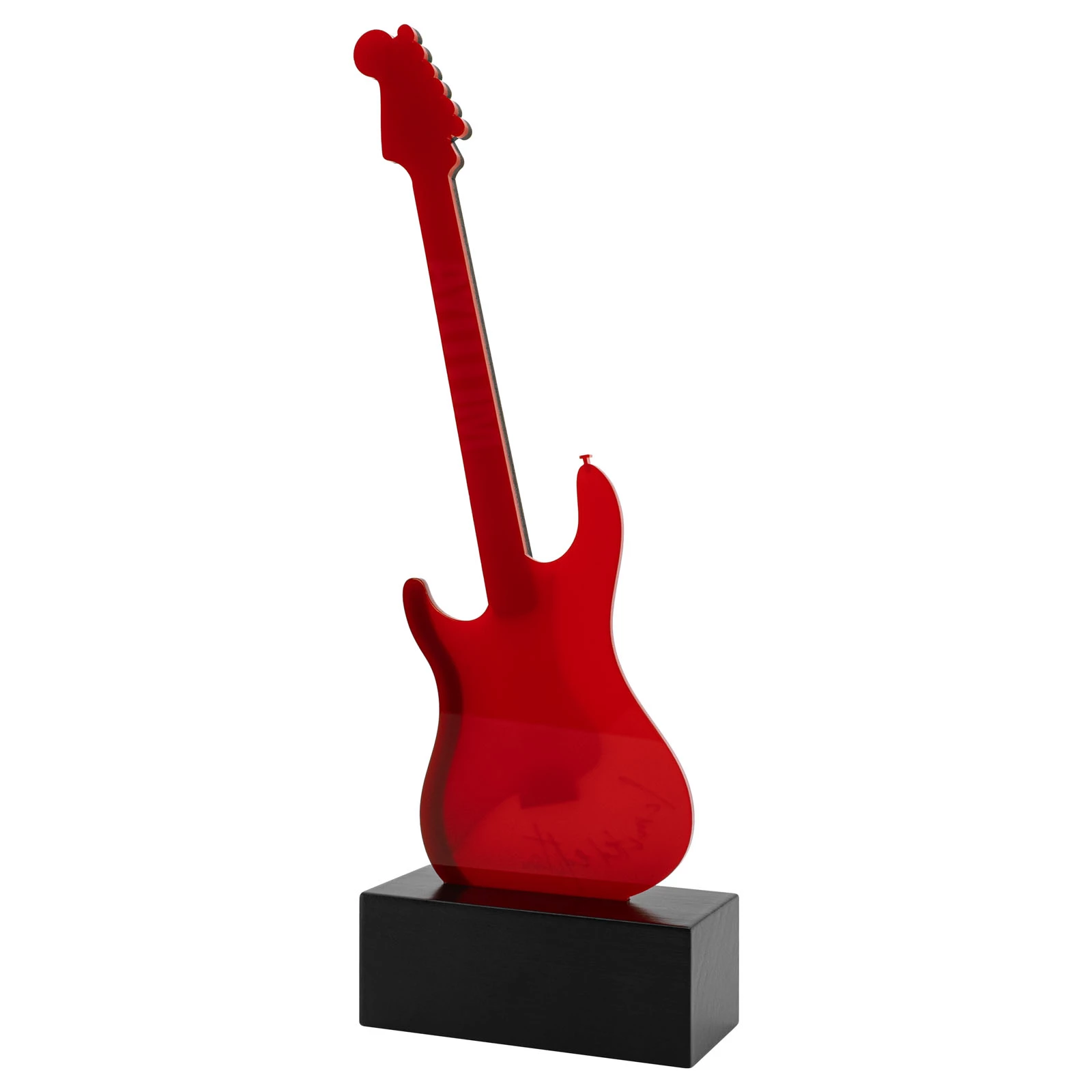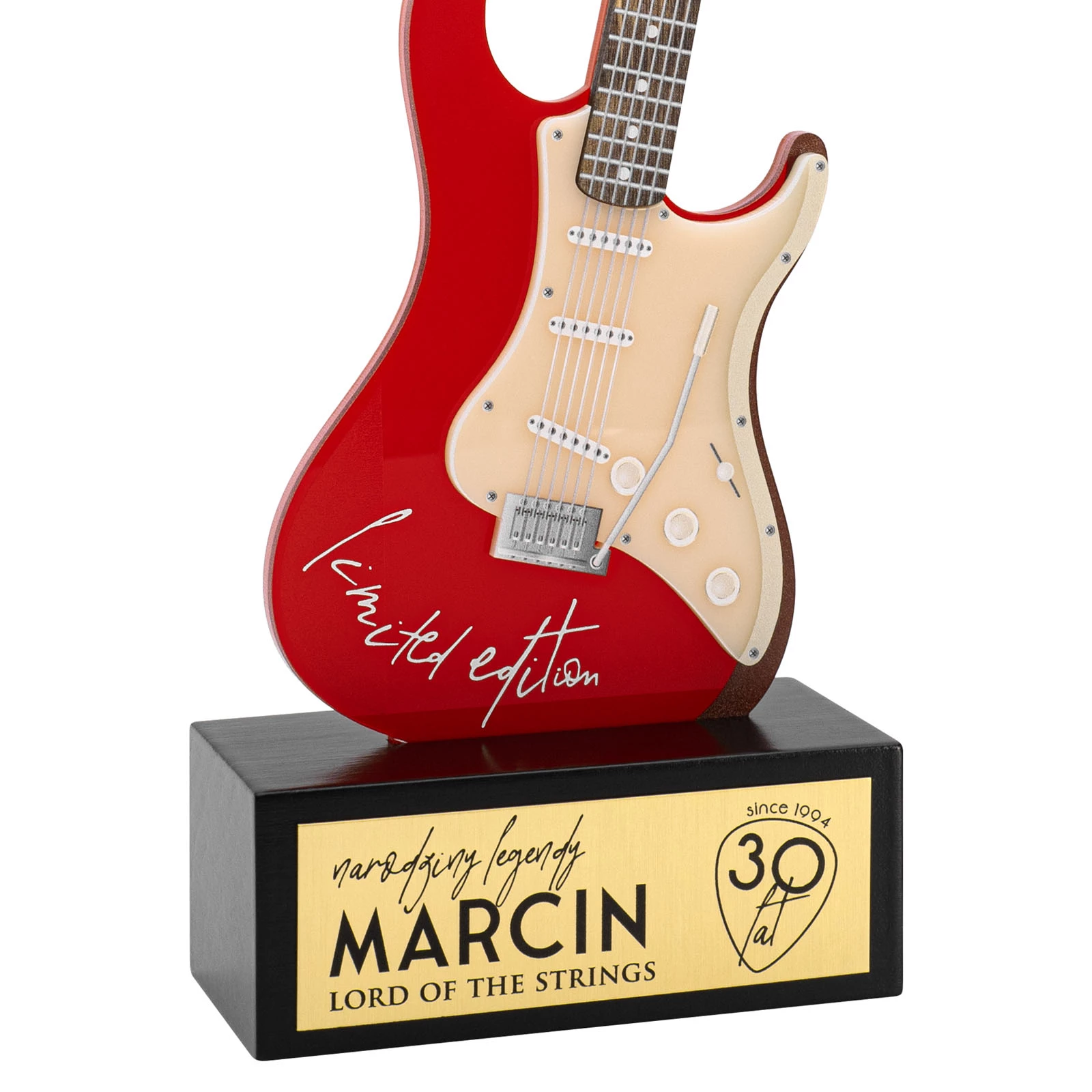 Statuetka akrylowa w kształcie gitary wręczana podczas wydarzeń muzycznych, kulturalnych lub osobistych. Statuetka została wykonana z naturalnej sklejki brzozowej o grubości 3 mm oraz akrylu w kolorze kremowym i czerwonym. Całość została umieszczona na solidnym, drewnianym postumencie wykonanym z litego drewna olchowego pokrytego czarnym lakierem. Na postumencie umieszczamy tabliczkę z mosiądzu o grubości 0,6 mm. Na statuetce wykonujemy trwały nadruk UV, który dzięki precyzyjnej technologii druku zachowuje wyrazistość i intensywność kolorów. Nasza statuetka w subtelny sposób oddaje hołd pasji, zaangażowaniu i sztuce muzycznej. Sprawdzi się również jako element dekoracyjny, który znajdzie honorowe miejsce w przestrzeni muzyka. To nie tylko nagroda, ale także symbol uznania i inspiracja do dalszego rozwoju artystycznego. Jest to idealny wybór na prestiżową nagrodę lub prezent, który z pewnością zachwyci swoim designem i jakością wykonania. Statuetka wykonywana jest według wzoru przedstawionego w galerii.